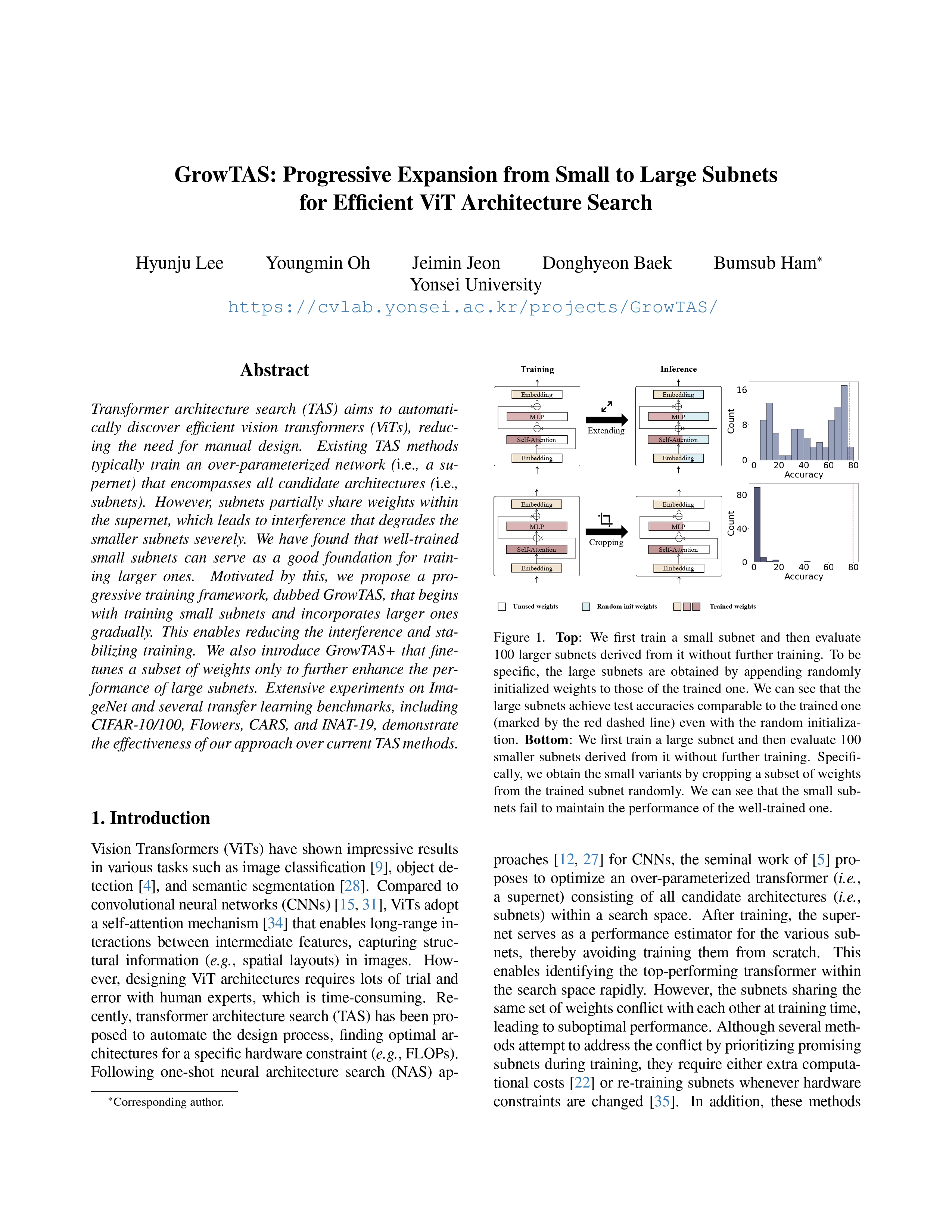 Transformer architecture search (TAS) aims to automatically discover efficient vision transformers (ViTs), reducing the need for manual design. Existing TAS methods typically train an over-parameterized network (i.e., a supernet) that encompasses all candidate architectures (i.e., subnets). However, subnets partially share weights within the supernet, which leads to interference that degrades the smaller subnets severely. We have found that well-trained small subnets can serve as a good foundation for training larger ones. Motivated by this, we propose a progressive training framework, dubbed GrowTAS, that begins with training small subnets and incorporates larger ones gradually. This enables reducing the interference and stabilizing training. We also introduce GrowTAS+ that fine-tunes a subset of weights only to further enhance the performance of large subnets. Extensive experiments on ImageNet and several transfer learning benchmarks, including CIFAR-10/100, Flowers, CARS, and INAT-19, demonstrate the effectiveness of our approach over current TAS methods.